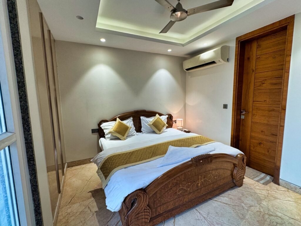 Bedrooms in furnished service apartments Faridabad are thoughtfully designed with: